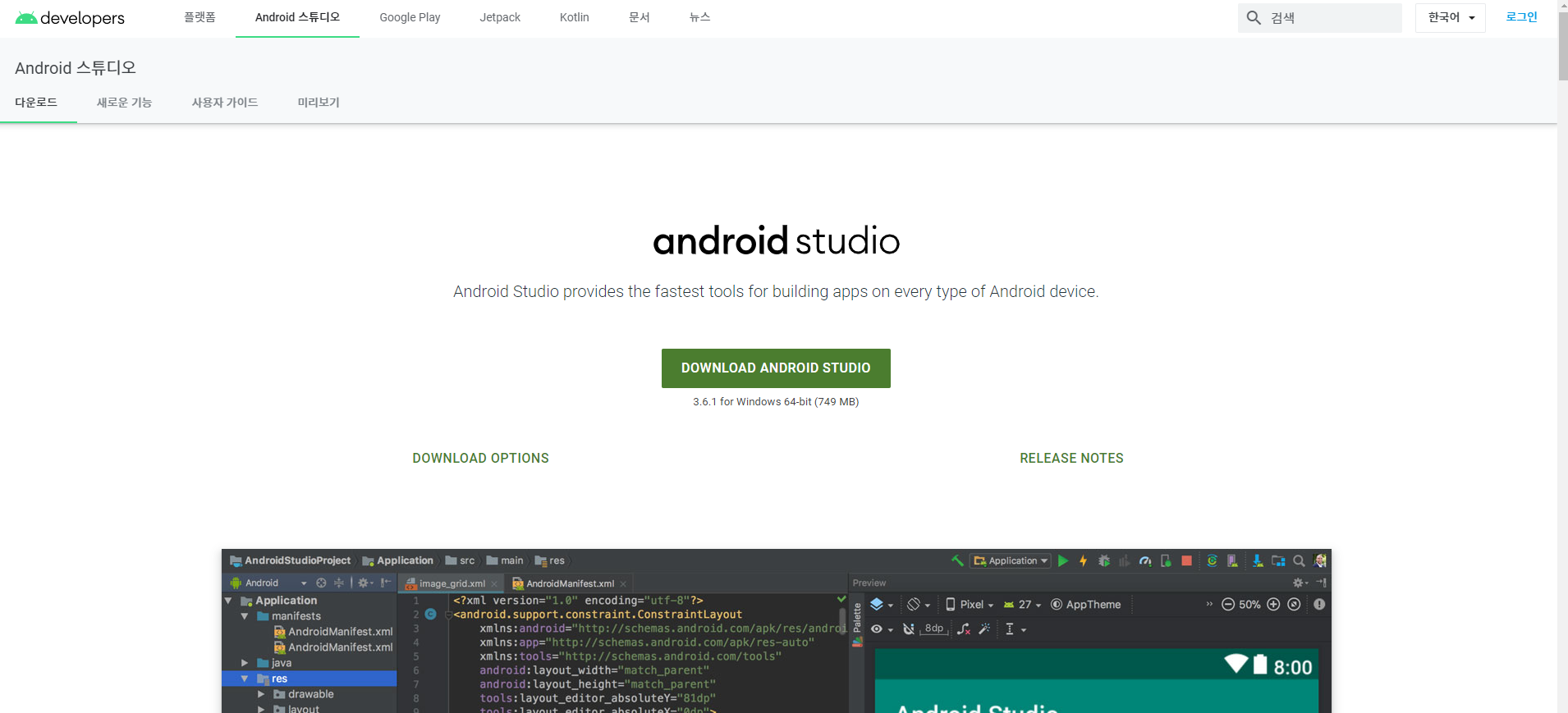 1. Android 홈페이지에서 Android Studio 프로그램을 다운로드 받습니다.