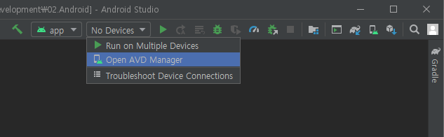 아래 이미지를 참고하여 'Open AVD Manager'를 선택합니다.