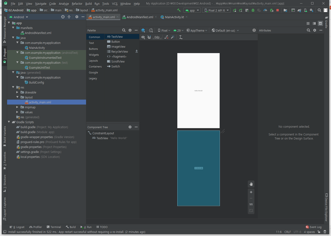 5. 앱 실행 시 나오는 화면은 'app - res - layout - activity_main.xml' 에서 만들어진 기본 화면입니다.