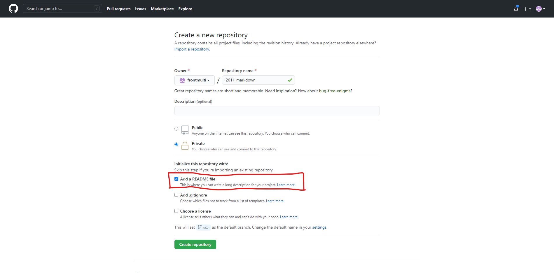 github에서 repository를 생성할 때 'Add a README file'을 체크한 후 생성하면 README 파일이 자동으로 생성됩니다.