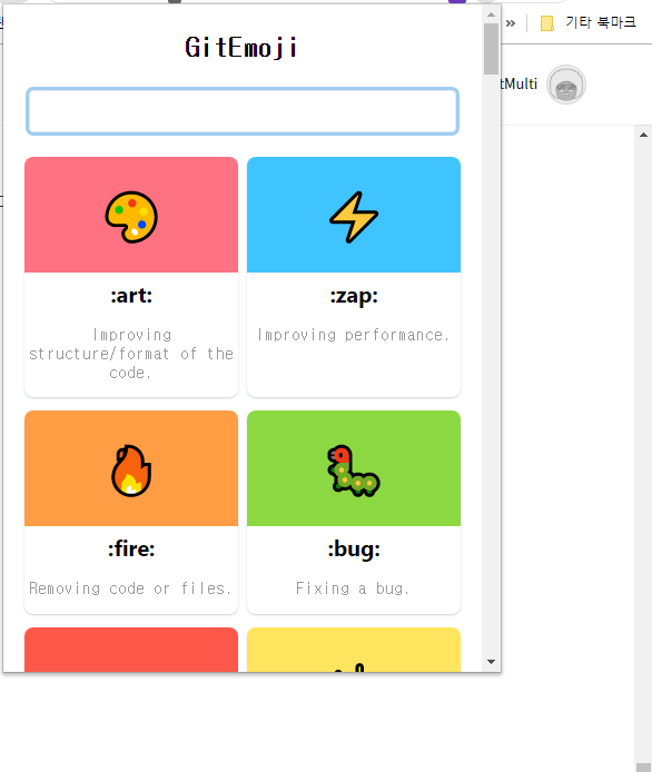 위의 크롬 확장앱을 설치하시면 아래 화면과 같이 필요한 GitEmoji를 검색하고
