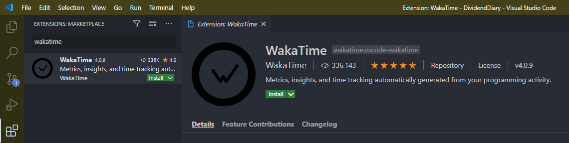3-2. Extensions: Marketplace에서 'wakatime' 검색 후 'Install'